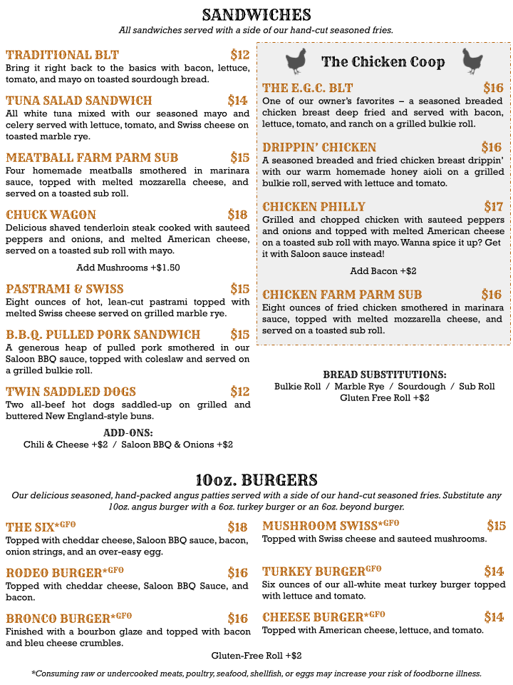Welcome to Saloon No. 6, a culinary gem located at 141 Worcester Rd, Webster, MA. This lively establishment offers an exciting menu that easily makes it a local favorite. Start your day with the Bacon, Egg & Cheese breakfast sandwich for just $12. For lunch or dinner, indulge in their delectable calzones like the Side Saddle or the Desert Heat Calzone, each priced at $20.